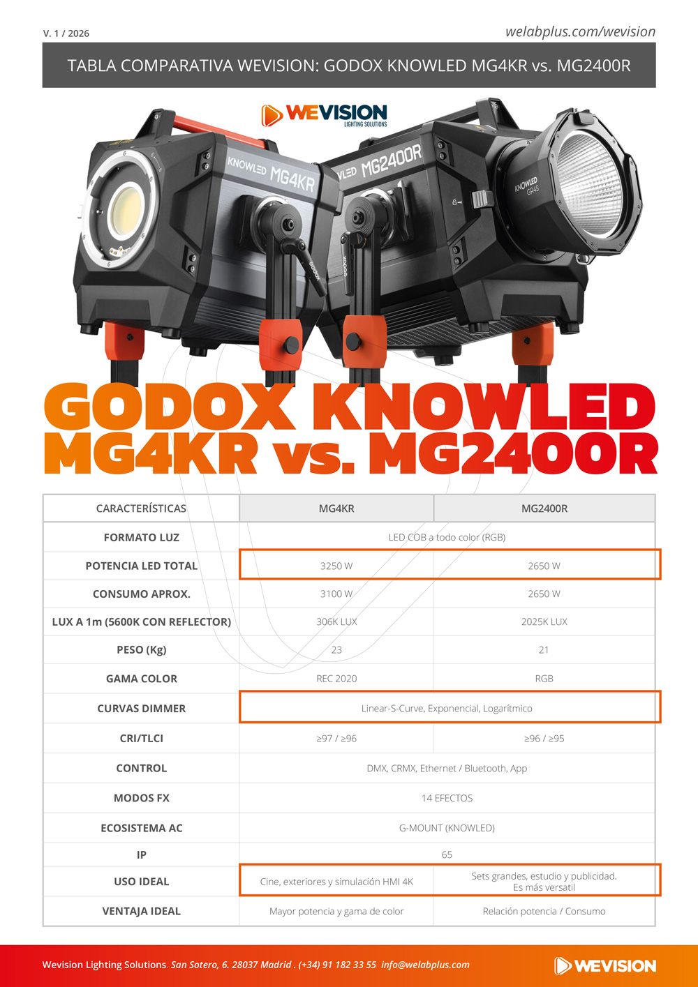 Cuando hablamos de iluminación de alto nivel en cine y producción audiovisual, la gama Knowled de Godox se ha convertido en una referencia. En esta comparativa analizamos en detalle dos de sus modelos más potentes: el Godox Knowled MG4KR y el MG2400R, dos focos LED diseñados para entornos exigentes.
